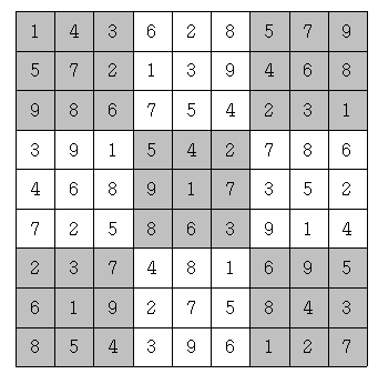위 그림은 참 잘도 스도쿠 퍼즐을 푼 경우이다. 각 행에 1부터 9까지의 숫자가 중복 없이 나오고, 각 열에 1부터 9까지의 숫자가 중복 없이 나오고, 각 3×3짜리 사각형(9개이며, 위에서 색깔로 표시되었다)에 1부터 9까지의 숫자가 중복 없이 나오기 때문이다.