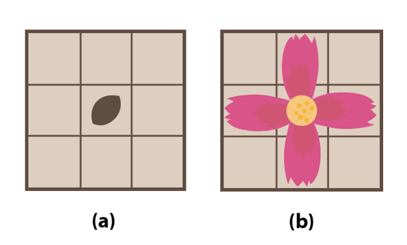 꽃밭은 N*N의 격자 모양이고 진아는 씨앗을 (1,1)~(N,N)의 지점 중 한곳에 심을 수 있다. 꽃의 씨앗은 그림 (a)처럼 심어지며 1년 후 꽃이 피면 그림 (b)모양이 된다.