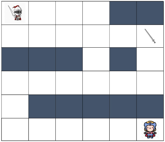 마왕은 용사를 괴롭히기 위해 공주에게 저주를 걸었다. 저주에 걸린 공주는 T시간 이내로 용사를 만나지 못한다면 영원히 돌로 변하게 된다. 공주님을 구출하고 프러포즈 하고 싶은 용사는 반드시 T시간 내에 공주님이 있는 곳에 도달해야 한다. 용사는 한 칸을 이동하는 데 한 시간이 걸린다. 공주님이 있는 곳에 정확히 T시간만에 도달한 경우에도 구출할 수 있다. 용사는 상하좌우로 이동할 수 있다.