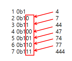 창영이는 4와 7로 이루어진 수를 좋아한다. 창영이가 좋아하는 수 중에 K번째 작은 수를 구해 출력하는 프로그램을 작성하시오.