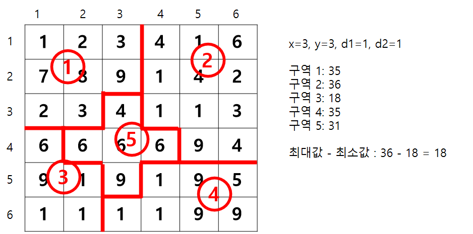 - 3번 선거구: x+d1 ≤ r ≤ N, 1 ≤ c < y-d1+d2