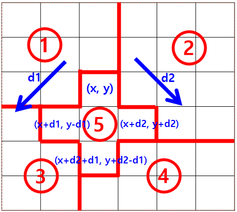 - 기준점 (x, y)와 경계의 길이 d1, d2를 정한다. (d1, d2 ≥ 1, 1 ≤ x < x+d1+d2 ≤ N, 1 ≤ y-d1 < y < y+d2 ≤ N)