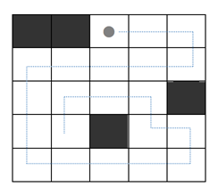 N×M 보드 위에서 할 수 있는 게임이 있다. 보드는 크기가 1×1인 정사각형 칸으로 나누어져 있다. 보드의 각 칸은 빈 칸 또는 장애물이다. 장애물은 아래 그림에선 어두운 사각형으로 표시되어져