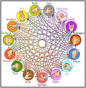 혹시 마지막으로 엠티를 간 것이 언제인가? 엠티를 안간지 꽤 오래됐다면 요즘 유행하는 인싸들의 가위바위보를 모를 것이다. 요즘 인싸들은 엠티에서 평범한 가위바위보를 시시하다는 이유로 더 이상 취급하지 않는다. 대신 가위불바위총번개악마용물공기보스펀지늑대나무사람뱀을 한다. 이 게임의 명칭이 다소 긴 관계로 문제 내에서는 전체 명칭을 적는 대신 이 게임의 또 다른 이름인 인싸 가위바위보로 부르겠다. 인싸 가위바위보는 평범한 가위바위보와 같이 각 손동작간의 상성이 정해져있다.