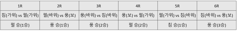 밑의 표는 침, 펄, 풍 세 사람이 인싸 가위바위보를 진행하는 예시이다. 우승을 위해 필요한 승수는 3승이고 침, 펄, 풍 순서로 경기를 진행한다.