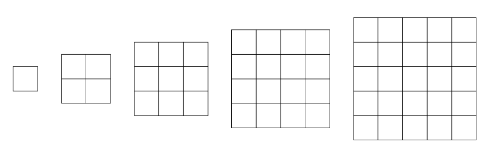 <그림 1>과 같이 정사각형 모양을 한 다섯 종류의 색종이가 있다. 색종이의 크기는 1×1, 2×2, 3×3, 4×4, 5×5로 총 다섯 종류가 있으며, 각 종류의 색종이는 5개씩 가지고 있다. <그림 1> 색종이를 크