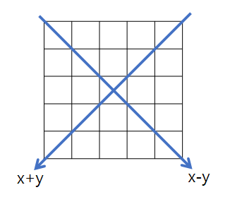 왼쪽 위에서 오른쪽 아래로 내려오는 대각선에 있는 칸들은 좌표가 (x, y)일 때 x-y 값이 모두 같다. 그리고 오른쪽 위에서 왼쪽 아래로 내려오는 대각선은 x+y 값이 같다.