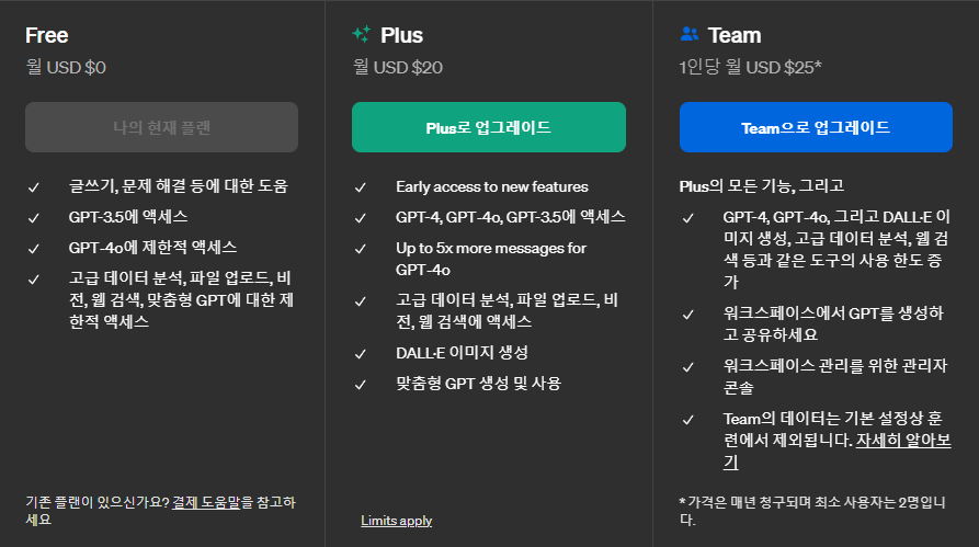 무료 버전도 GPT-4o를 사용할 수 있기는 하다. 그런데 이제 "제한적" 단어가 더해진....
