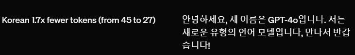 - 영어와 코드에 대한 텍스트 처리에 대해서는 GPT-4 Turbo 성능과 맞먹으며, 비영어 텍스트 처리에 대해서도 상당한 개선을 보였으며, 속도는 훨씬 더 빨라졌고, API 사용시 50% 저렴하다.