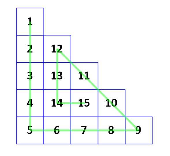 피라미드 모양에서 가장 아래 행을 제외한 각 행을 반 칸씩 왼쪽으로 밀어보면 아래와 같은 모양이 나온다.